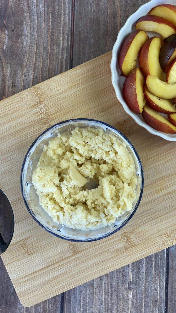 Vierte la mezcla sobre los melocotones y deja aparte por el momento.Para esta receta he preparado el crumble con la batidora para acelerar el trabajo, pero también puedes hacerlo a mano.