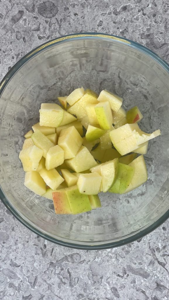 Comienza la preparación de los cuadrados de manzana y ricotta lavando la manzana Golden. Elimina el corazón y córtala en trozos, yo he dejado la piel pero si prefieres puedes quitarla.