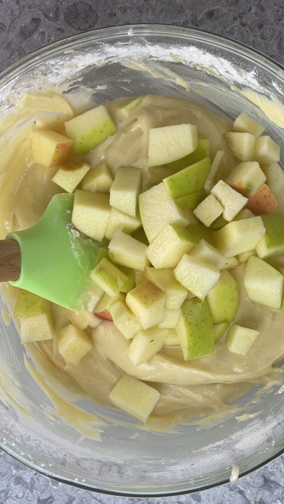 Termina la masa con la adición de las manzanas.