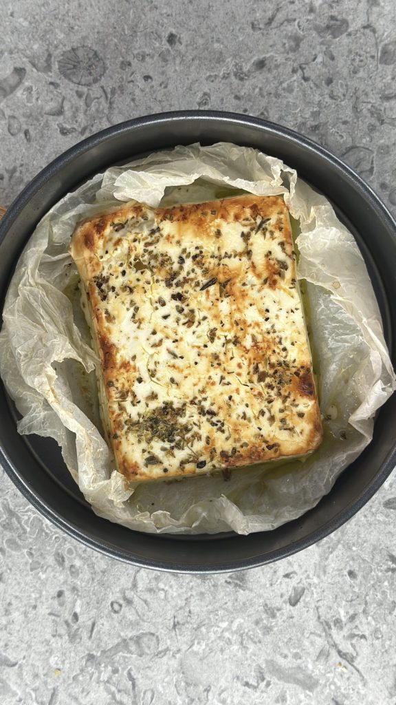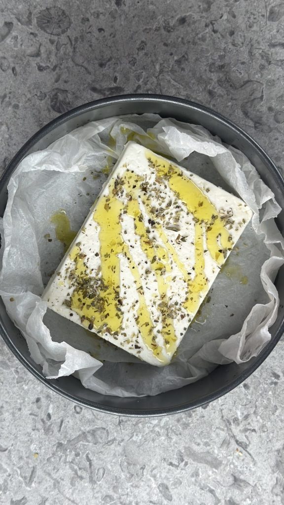 Empieza la preparación de la ensalada de garbanzos y aguacate por la feta: colócala en una bandeja y sazónala con pimienta negra, orégano seco y un chorrito de aceite de oliva virgen extra.