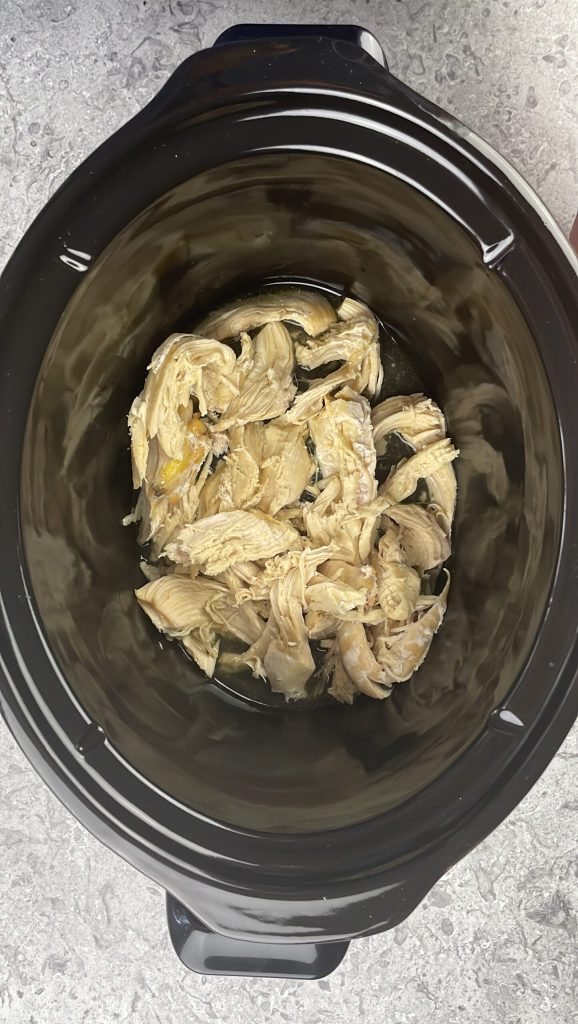 Lo cociné en slow cooker con un poco de aceite de oliva virgen extra en modo HIGH durante 4 horas, pero también se puede hacer a la plancha o en el horno.Una vez cocido el pollo, desmenúzalo con dos tenedores, ajusta la sal y deja enfriar.