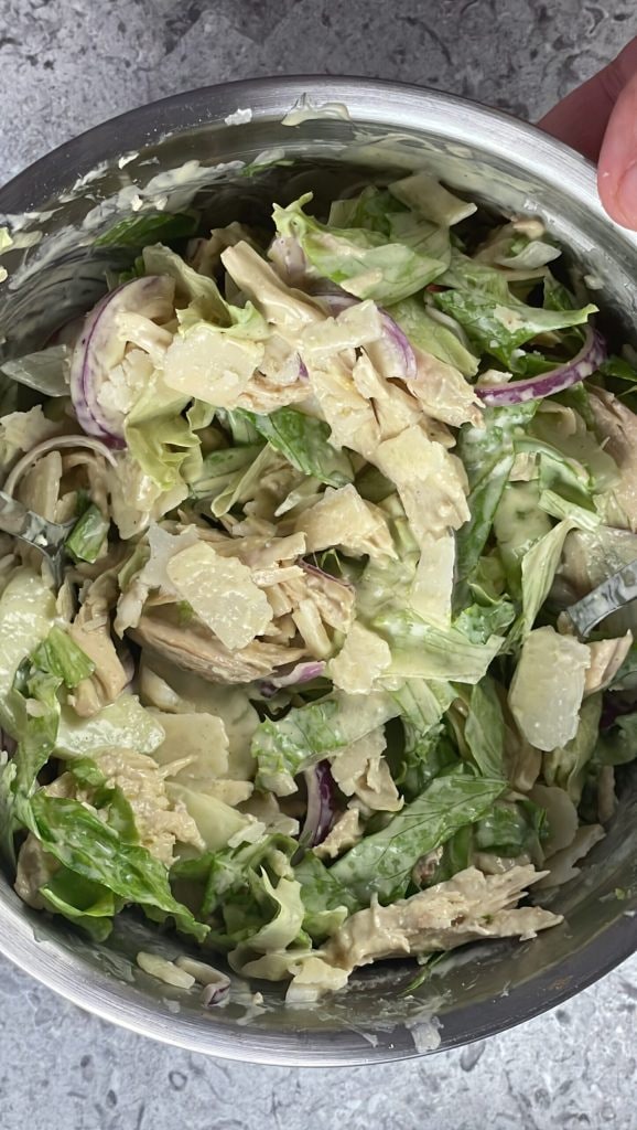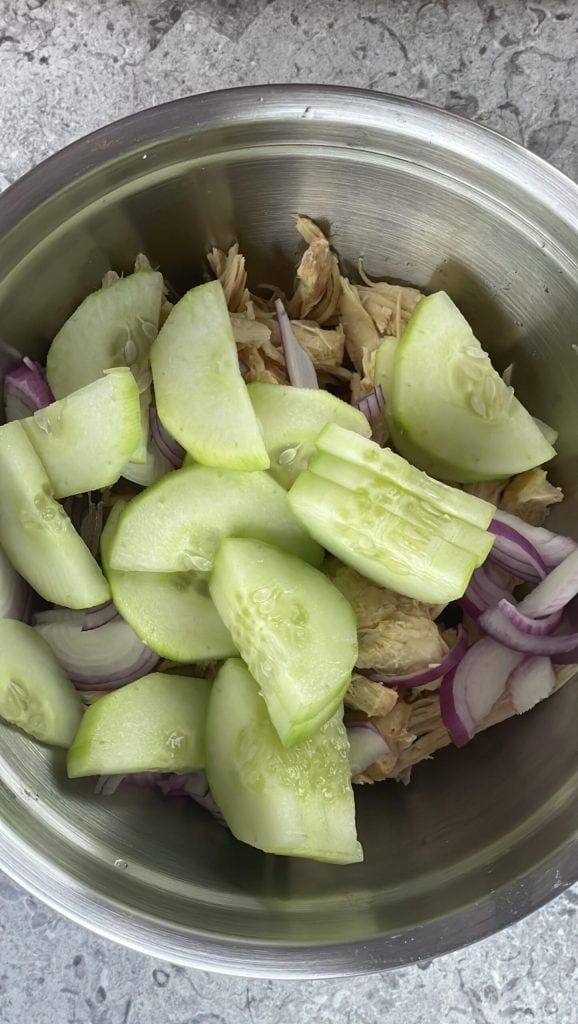 Ensalada de pollo veraniega con pepinos, cebolla de Tropea y parmesano, una receta sencilla y sabrosa, perfecta tanto para un almuerzo rápido como para llevar al trabajo.