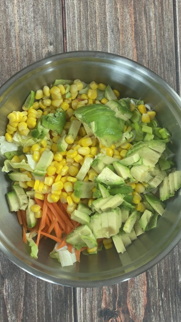 De esta forma será más fácil extraer la pulpa.Extrae la pulpa del aguacate con una cuchara y ponla en una ensaladera grande junto con la ensalada iceberg, el maíz escurrido y una zanahoria cortada en juliana.