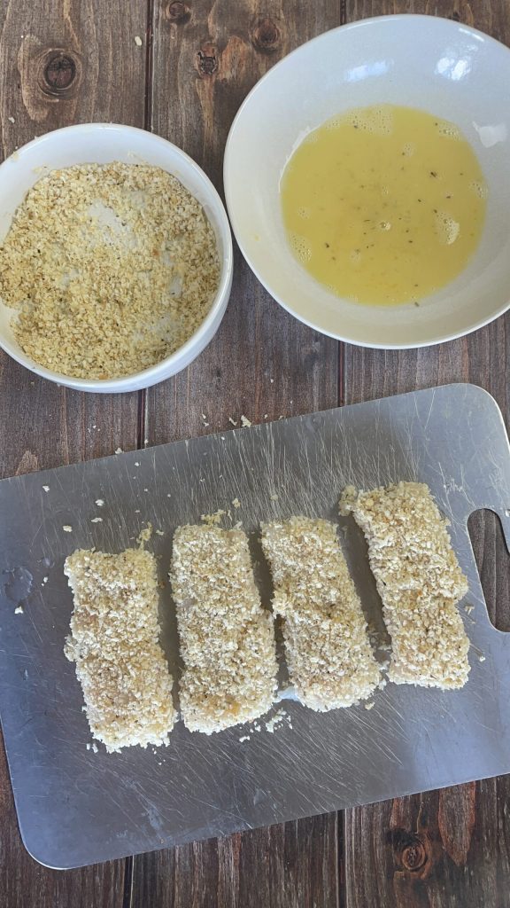 Coloca los filetes de pescado empanados en una bandeja para hornear cubierta con papel de horno.