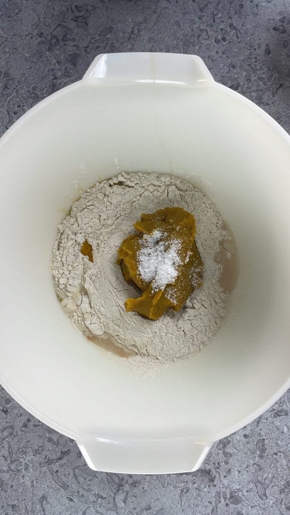 Comienza la preparación de la focaccia de calabaza disolviendo la levadura en el agua directamente en el tazón de la amasadora.