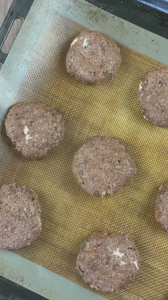 Trabaja rápidamente la masa con las manos húmedas para aplanarla y coloca las galletas en la bandeja del horno bien espaciadas.