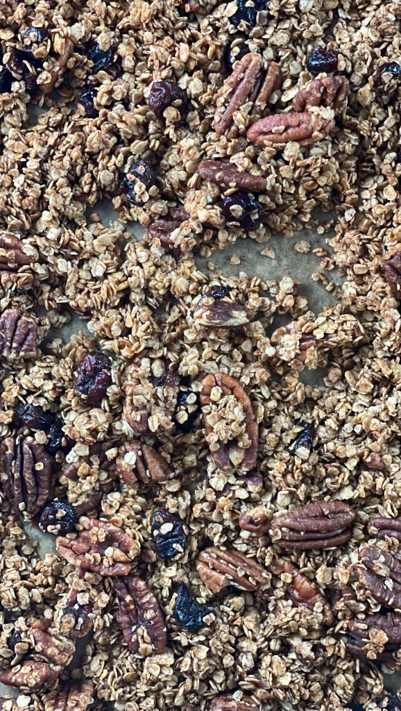 Una vez fría, desmenuza la granola especiada y transfiérela a un recipiente hermético o consúmela de inmediato.