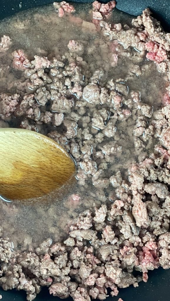 Añade la carne picada de ternera y deja que se dore bien.Cuando la carne esté bien dorada, agrega el vino blanco y deja evaporar a fuego alto.