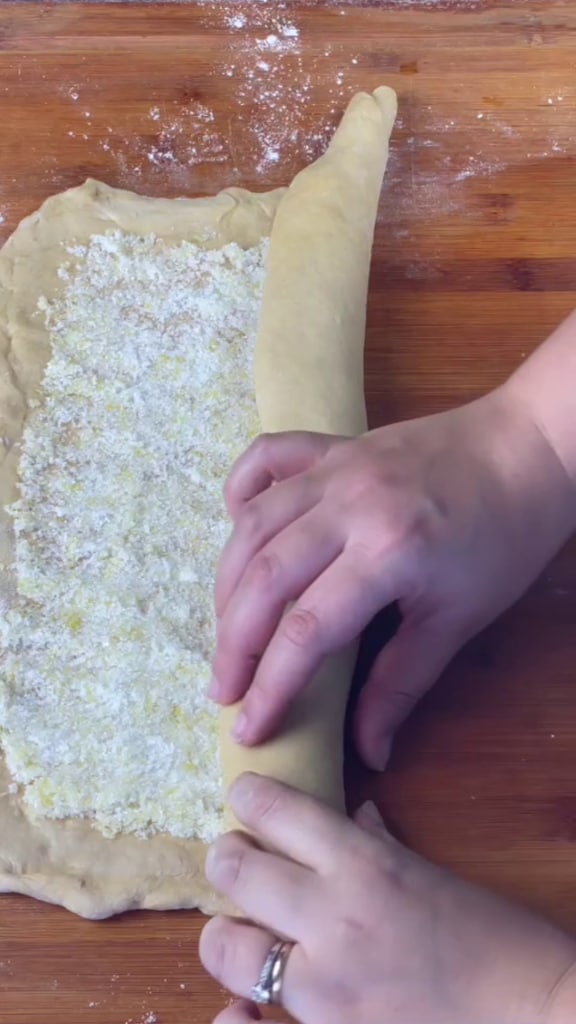 Enrolla el rectángulo de masa por el lado largo apretándolo bien.