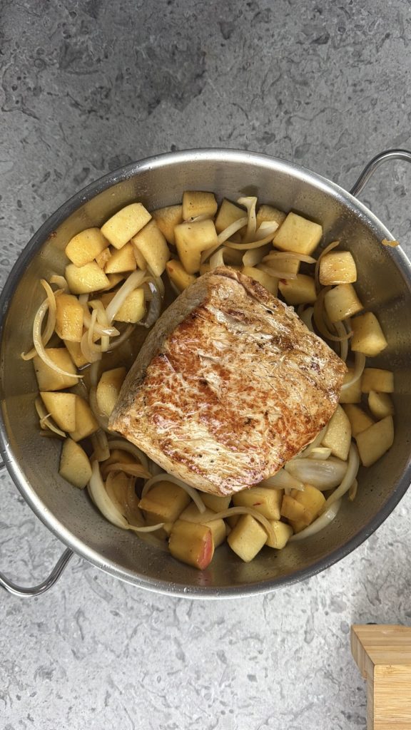 El secreto para lograr esta suavidad está en unas cuantas precauciones simples: empezar con un lomo de buena calidad y cocinarlo lentamente hasta alcanzar la temperatura adecuada en el centro. La manzana, ligeramente caramelizada durante la cocción, crea un contraste perfecto con la carne, haciendo que cada bocado sea envolvente y aromático.