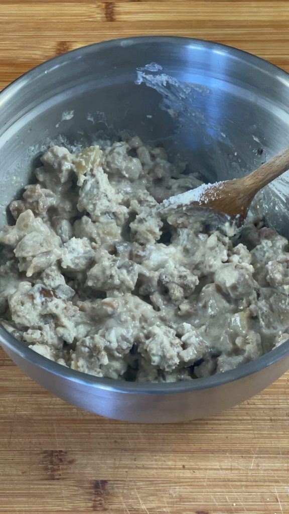 Introduce en el cuenco del relleno de los lumaconi también la mitad de la bechamel preparada.Mezcla con una cuchara o una espátula hasta obtener una mezcla homogénea.