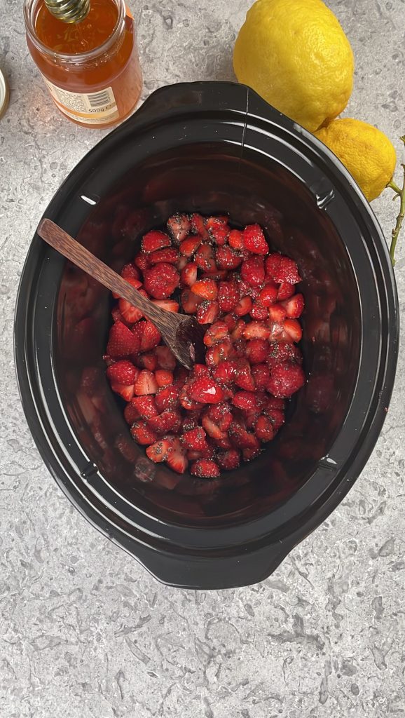 Divídelas a la mitad o en cuartos según su tamaño y colócalas en la olla de cocción lenta.Añade a las fresas cortadas las semillas de chía, el jugo de medio limón y la miel.