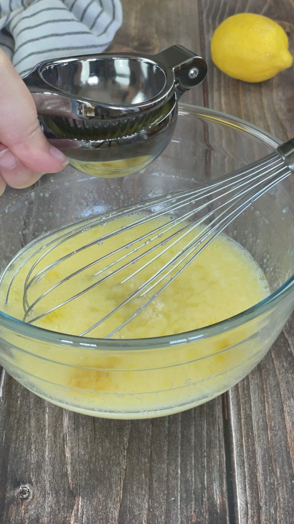 • Una vez obtenido un compuesto homogéneo, añade al bol también el zumo y la ralladura de un limón no tratado, la leche y el aceite de girasol.