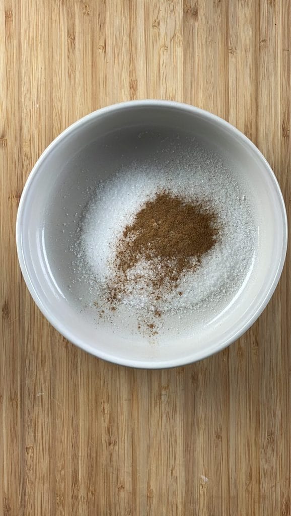 • Comienza la preparación de los palitos de french toast en freidora de aire poniendo en un bol pequeño el azúcar y la canela en polvo.