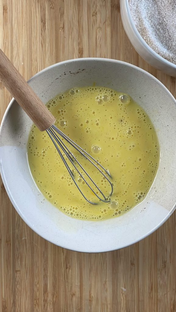 • Pasa los palitos de pan brioche primero por la mezcla de huevos y leche y luego por el azúcar con canela, asegurándote de cubrirlos bien.