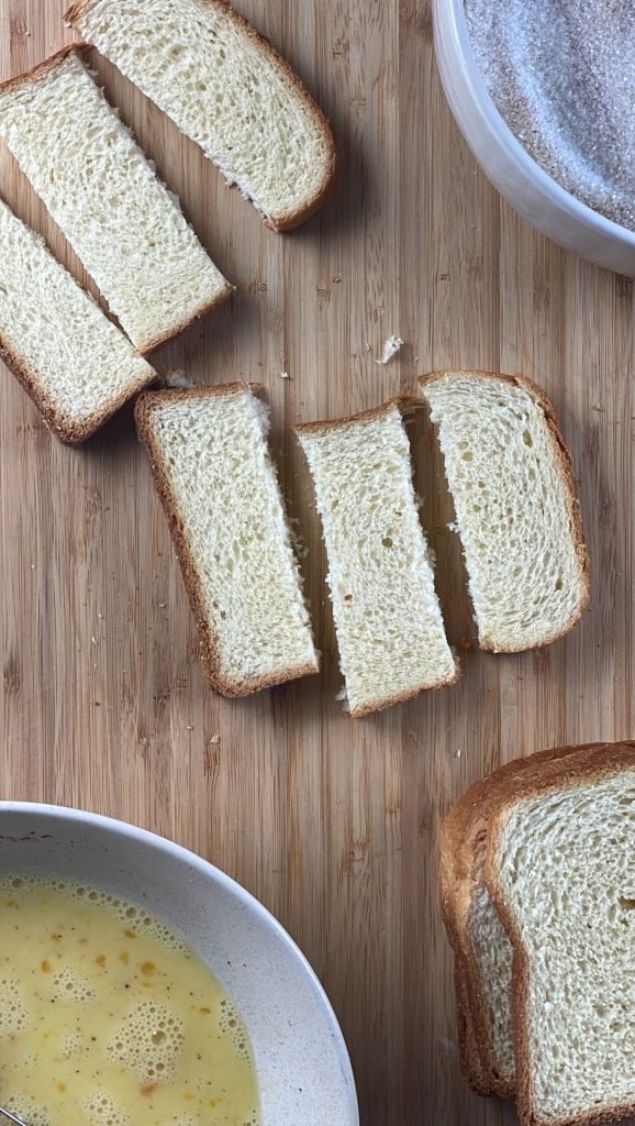 • Corta el pan brioche en rebanadas y luego cada rebanada en 3 partes.