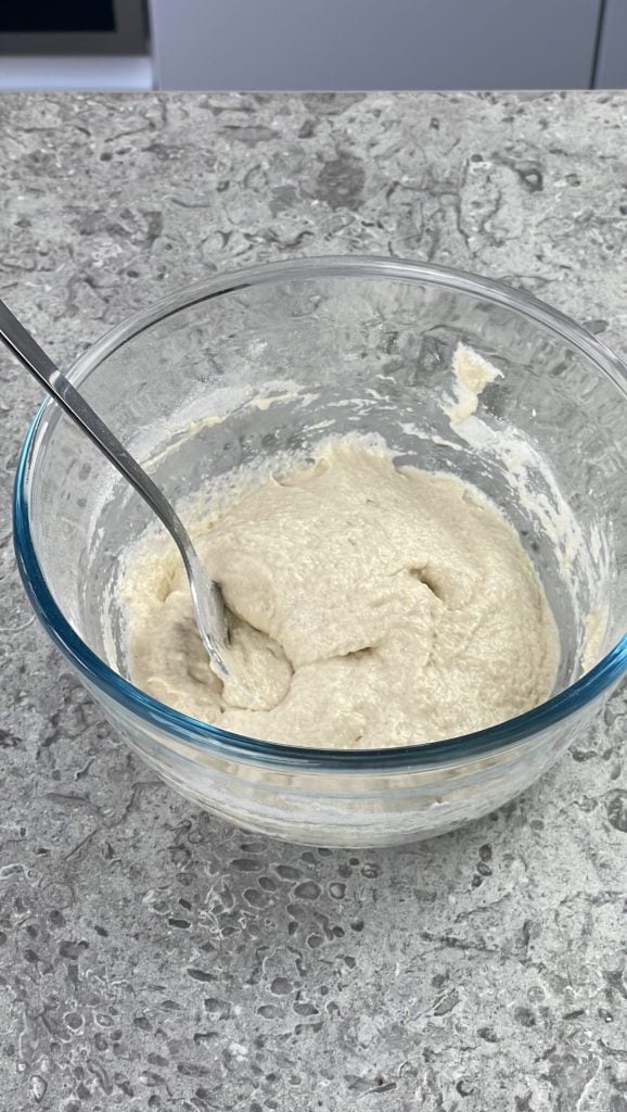 Deja disolver la levadura por 5 minutos.Añade también la harina manitoba poco a poco y mezcla bien.