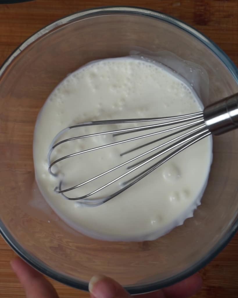 • Prepara el suero de leche: añade a la leche entera una cucharadita de vinagre de manzana o blanco y mezcla con un batidor. Verás que en poco tiempo se espesará ligeramente.