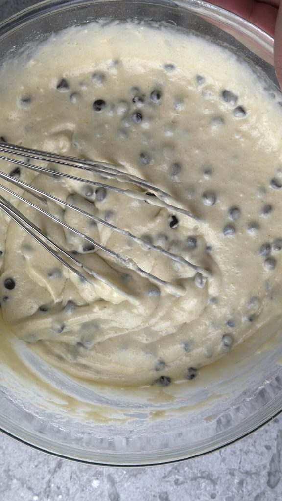 Termina la preparación con las gotas de chocolate mezclando una última vez para repartirlas de manera homogénea en la masa de los pancakes.