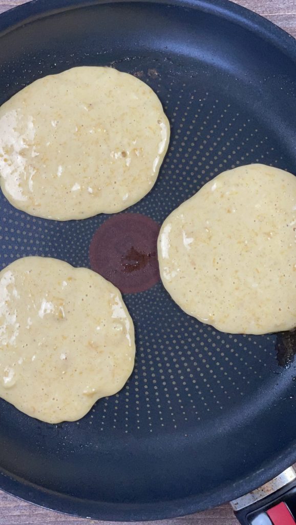 Deja reposar la masa de los pancakes en el frigorífico durante 30 minutos.Calienta una sartén antiadherente preferiblemente con el fondo plano.