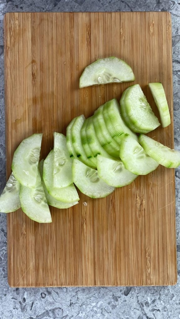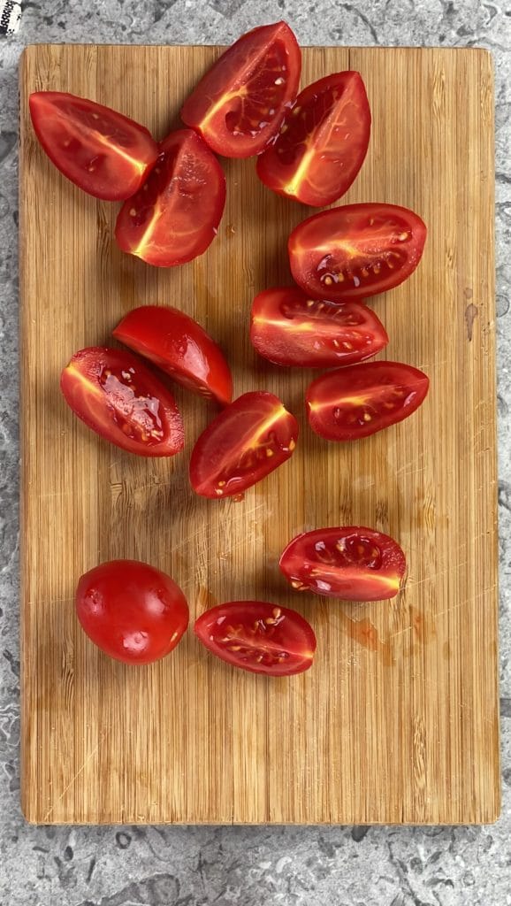 Lava y seca los tomates. Córtalos a la mitad o en cuartos, dependiendo de su tamaño.Lava el pepino y elimina los dos extremos.