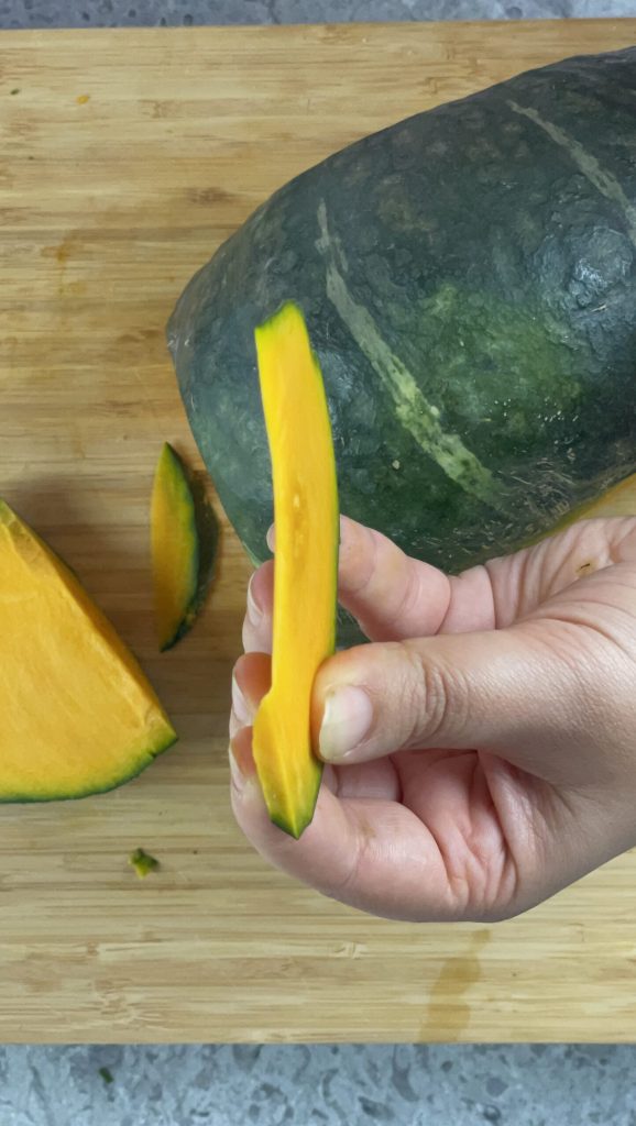 Comienza la preparación de la parmigiana de calabaza limpiando la calabaza delica y cortándola en rodajas de un par de milímetros de grosor.