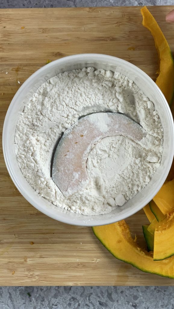 Pasa las rodajas de calabaza por la harina y sacúdelas bien para eliminar el exceso.
