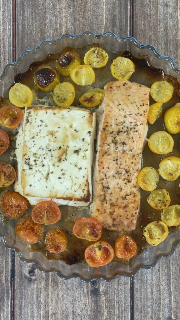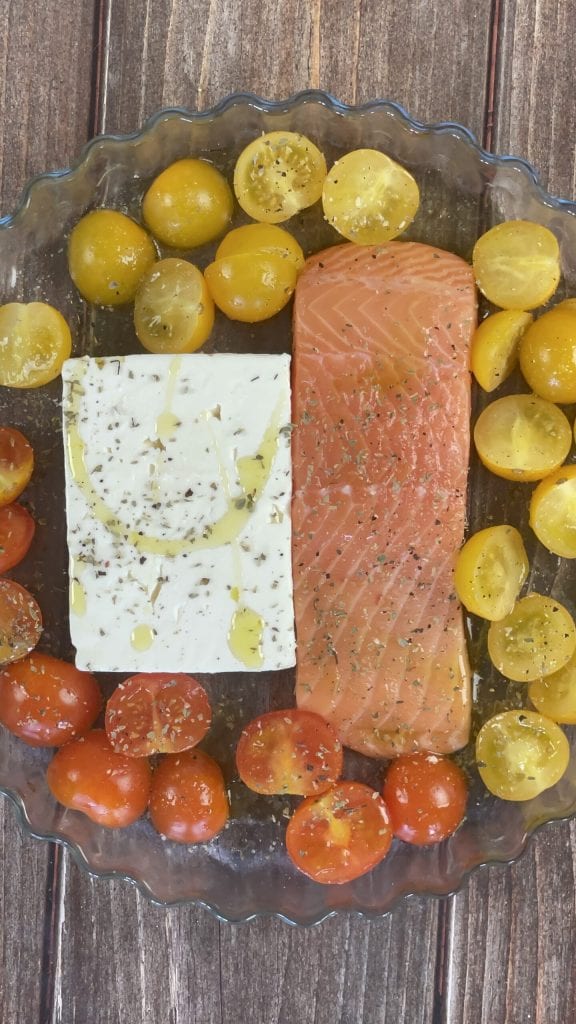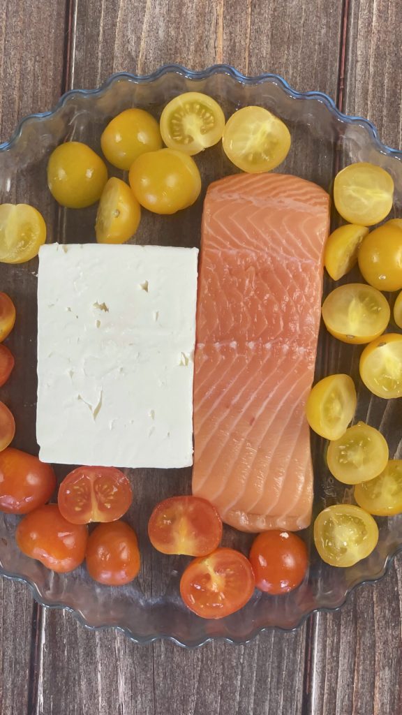 Pasta feta, salmón y tomatitos