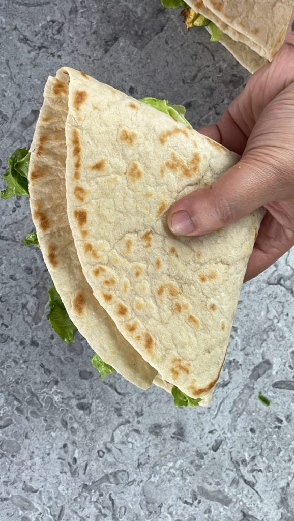 Termina colocando en el último cuarto una hoja de lechuga.Dobla la piadina desde el primer cuarto.