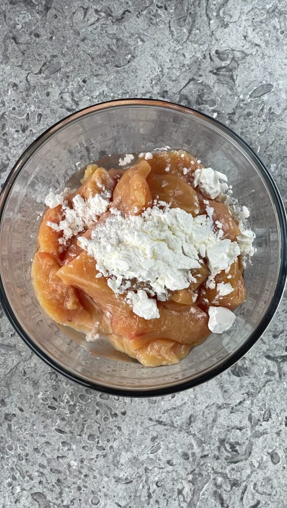 Transfiere el pollo a un cuenco y añade el vinagre de arroz y la fécula de maíz.Mezcla el pollo con una cuchara hasta que esté completamente cubierto.