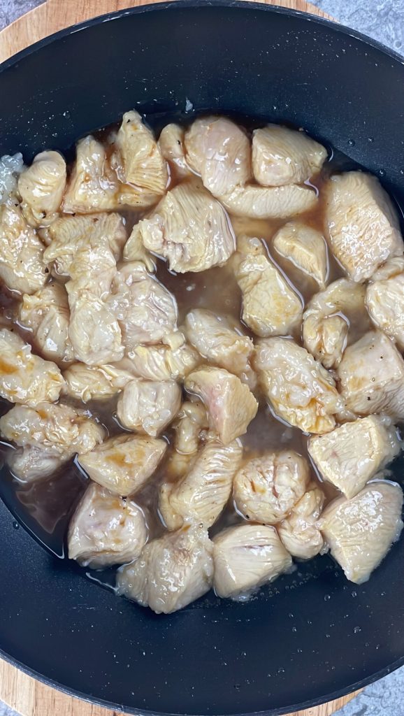 El secreto para obtener un pollo tierno y jugoso es la marinada con fécula de maíz y vinagre de arroz, que hace que la carne sea más suave y permite que la salsa se adhiera mejor durante la cocción. Las cebolletas, por otro lado, añaden una nota ligeramente dulce, realzando el sabor del pollo sin cubrirlo. Una última espolvoreada de semillas de sésamo otorga un toque crujiente que hace cada bocado aún más apetitoso.