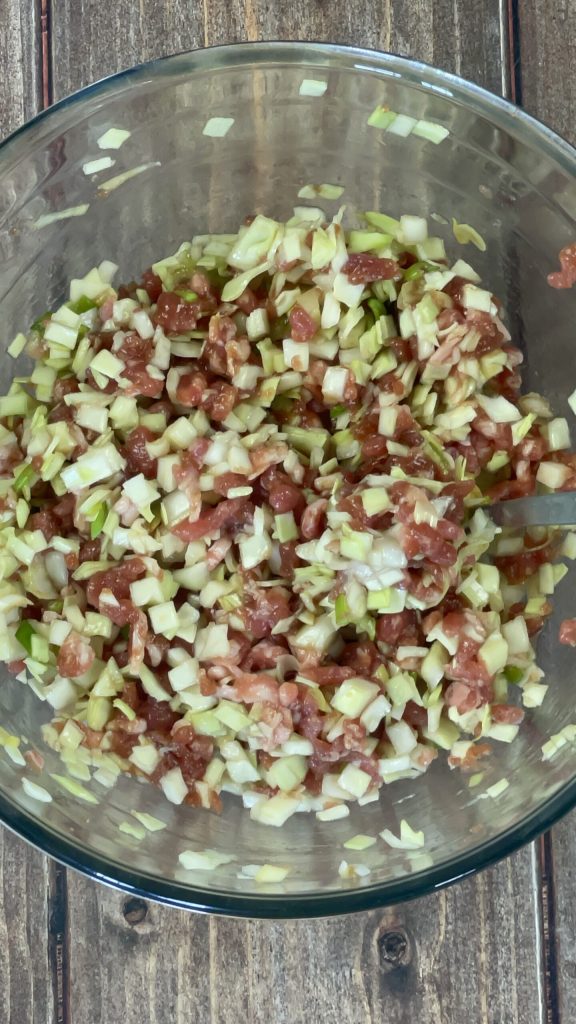 Añade también una cebolleta fresca picada finamente, incluida la parte verde.Añade al compuesto un huevo batido, la salsa de soja y el aceite de sésamo.