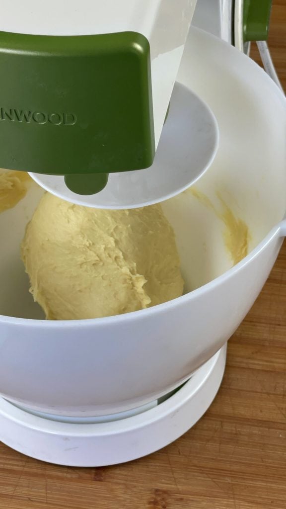 Empieza a amasar a velocidad media.Cuando la masa se haya compactado, empieza a añadir la mantequilla blanda en pequeños trozos, incorporándola completamente a la masa antes de añadir otro pedazo.