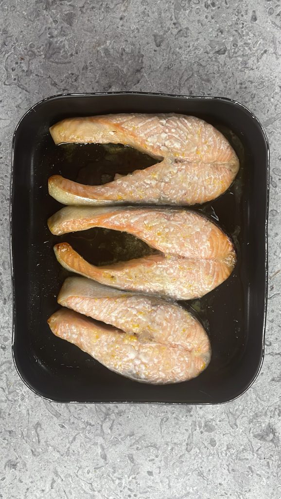 • Coloca los trozos de salmón en una fuente, vierte la salsa de miel y naranja y déjalos marinar durante al menos una hora, dándoles la vuelta de vez en cuando.