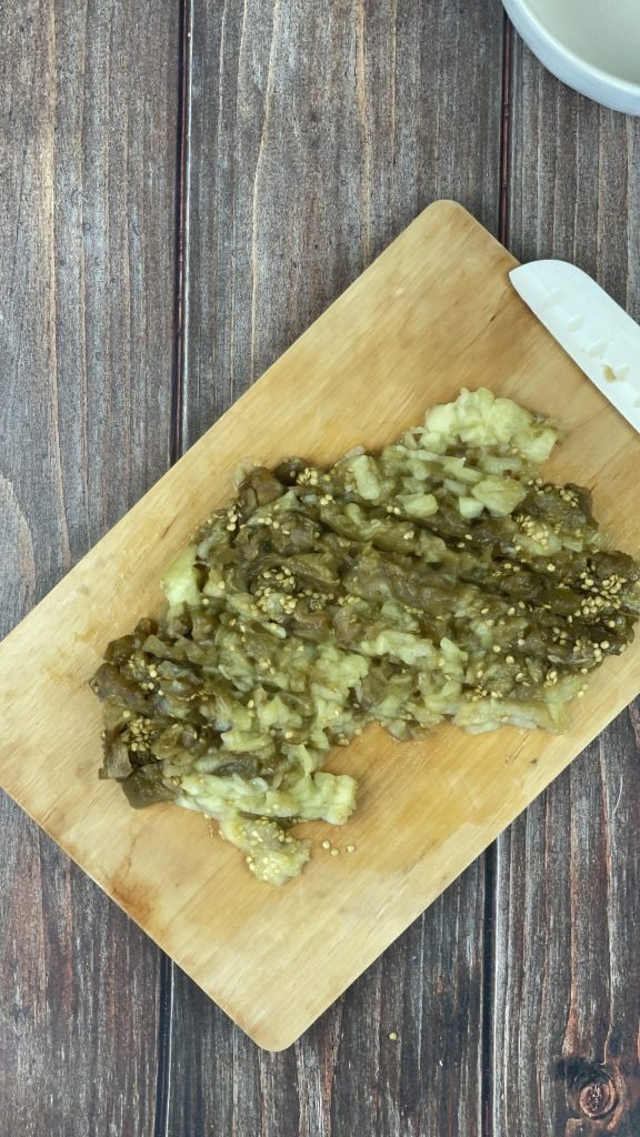 Cocina a fuego lento durante 12-15 minutos.Mientras tanto, corta la berenjena por la mitad y elimina la piel.
