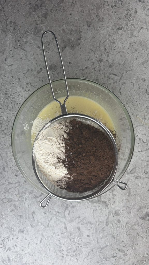Tamiza la harina 00, el cacao amargo en polvo y la levadura en polvo para dulces en el bol con los ingredientes húmedos.