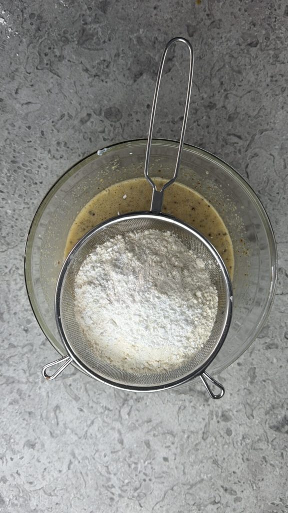 • Con la ayuda de un tamiz añade a los ingredientes líquidos tres vasitos de harina 00 y un sobre de levadura en polvo para repostería.