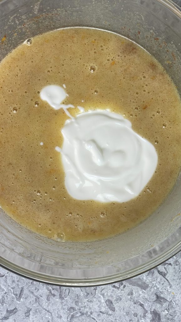 Añade también el yogur: yo he utilizado uno blanco, pero también va bien aromatizado de naranja o vainilla.