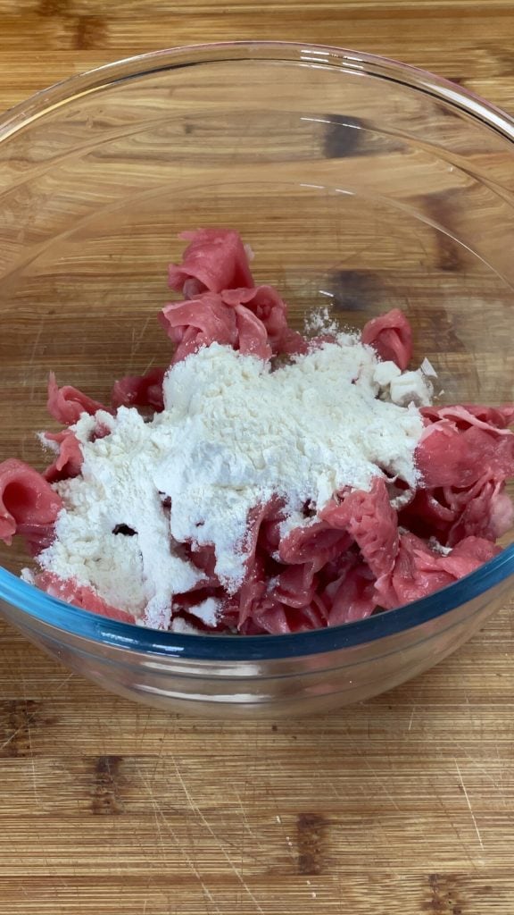 • Mezcla la carne y la harina con una cuchara: continúa hasta que todas las tiras estén completamente cubiertas de harina.