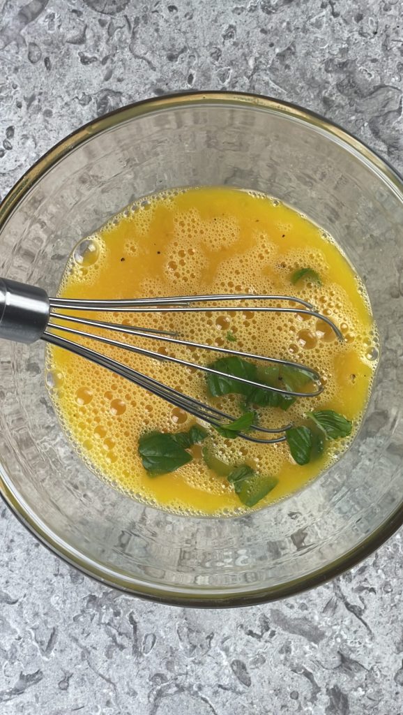 Comienza la preparación de la tortilla al horno con feta y tomatitos rompiendo en un bol cuatro huevos medianos.