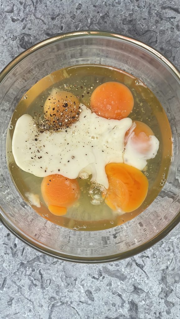 Empieza la preparación de las tostadas de aguacate con huevos revueltos rompiendo los huevos en un cuenco. Añade también la leche y condiméntalos con sal y pimienta negra.