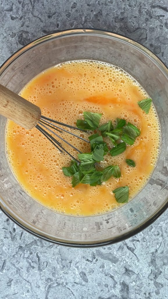 Añade si quieres algunas hojas de albahaca fresca.Calienta en la sartén el aceite de oliva virgen extra con una nuez de mantequilla.