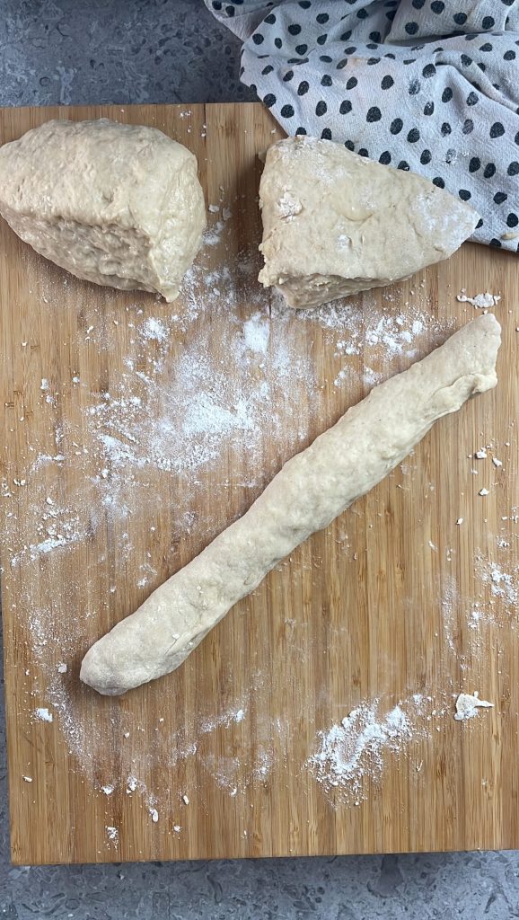 Déjalo reposar cubierto durante unos 30 minutos.En este punto la preparación es similar a la de los gnocchi: corta la masa en 8 partes y forma de cada una tantos bastones de aproximadamente 2 cm de ancho.
