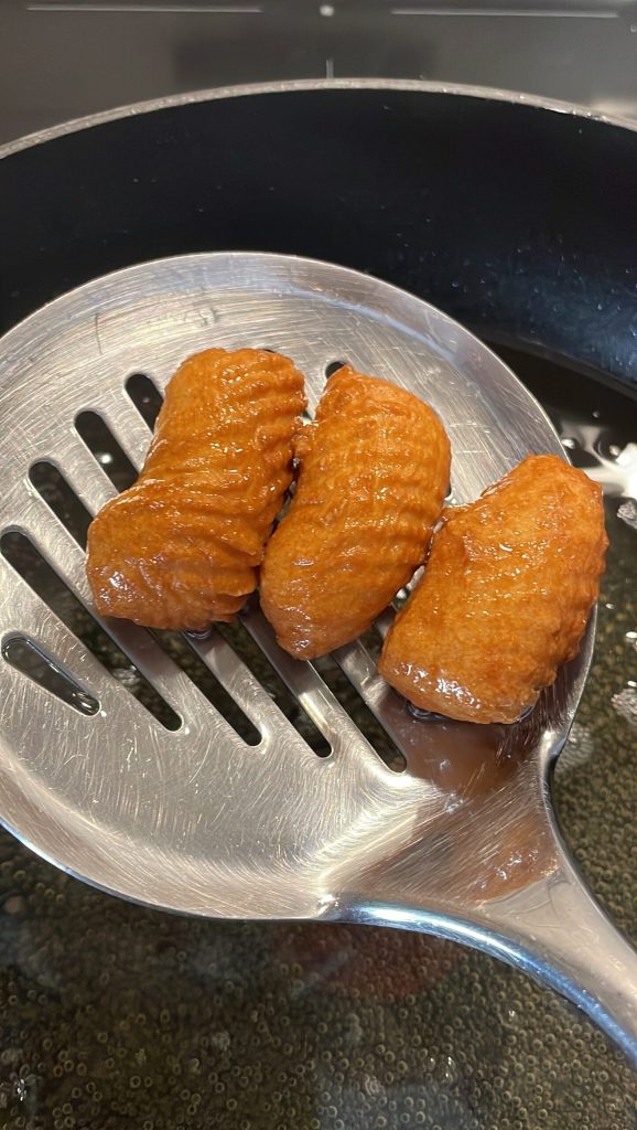 Si prefieres, puedes usar la freidora, ajústala a 170°C y cocina hasta que estén bien dorados.Calienta la miel de higos a fuego muy bajo en una sartén de bordes altos o en una cazuela hasta que se vuelva bastante fluida