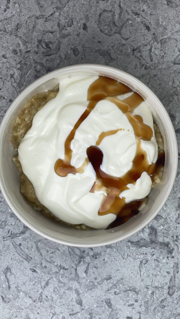 Añade al puré de plátano el yogur – yo he usado uno natural blanco – y el sirope de arce.