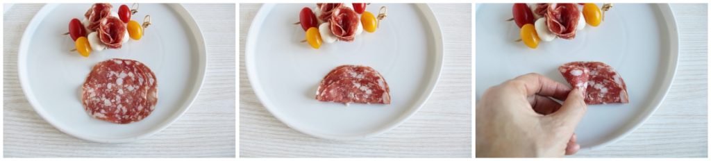 • Mientras tanto, preparad las rositas de salami. Superponed dos lonchas de salami (aunque con una sola es suficiente), doblarlas a la mitad, y luego comenzad a enrollarlas