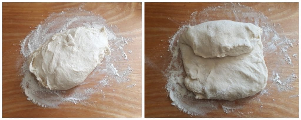 Voltead la masa sobre la mesa de trabajo enharinada y hagan unos pliegues (3 o 4) hasta que la masa muestre cierta resistencia.