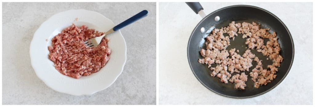 • Mientras tanto, quita la piel a la salchicha y desmenúzala, aplastándola con un tenedor y colócala en una sartén con 3 cucharadas de aceite de oliva virgen extra y sofríe durante unos minutos. Si te gusta puedes añadir 1/2 cebolla picada.