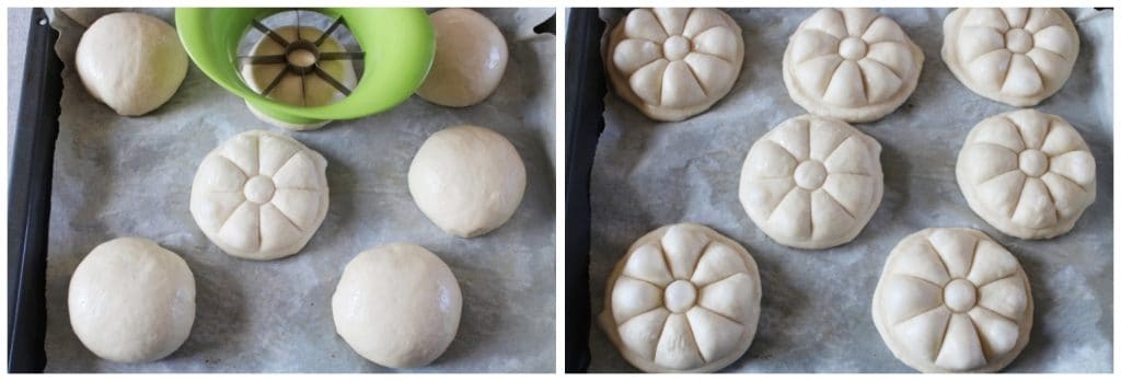 Como decía, la receta es realmente sencilla, al alcance de todos. Después de haber amasado todos los ingredientes en la batidora, dejé que la masa fermentara hasta que duplicó su volumen. Luego, la dividí en bollitos de unos 125 g que dejé fermentar una hora más. Para darles forma de roseta, poco antes de hornear, utilicé un cortador de manzanas.