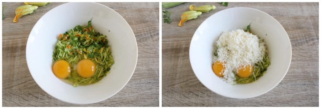 En un cuenco, mezcla los calabacines exprimidos, los huevos, el queso rallado, las flores de calabacín desmenuzadas, el perejil picado, una pizca de sal y de pimienta. Mezcla bien con un tenedor.